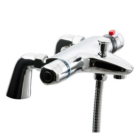 Sleek curves and a flat body give the Coral Modern Thermostatic Bath Shower Mixer a slightly retro feel that’s sure to complement a contemporary style bathroom. The thermostatic bath mixer tap has two handles with hot and cold indicators, so you always know which temperature you’re selecting – handy for those indulgent candlelit baths. With neat deck mounted legs and a low height of 92mm, this chrome mixer tap is a good fit for bathtubs with shelving or sloping walls above. It also comes with a diverter function, allowing you to turn your bath into a shower with ease.