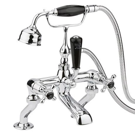 The Hudson Reed Topaz Black Edwardian style deck mounted bath shower mixer with shower kit features luxury cross head handles with black indices. Offers the perfect upgrade for any traditional bathroom, although these fittings are suitable for low pressure, we recommend a minimum operating pressure of 0.2 bar for best performance.