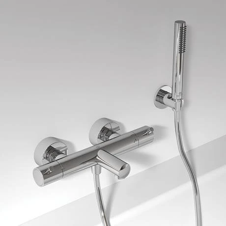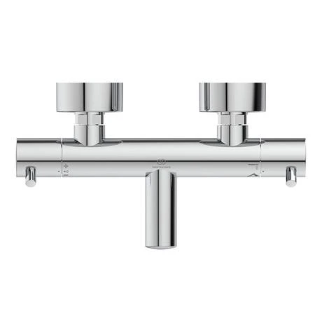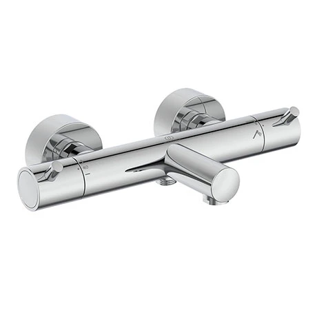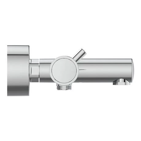 The Ideal Standard Ceratherm T125 Exposed Thermostatic Wall Mounted Bath Shower Mixer features a minimalistic cylindrical design with 2 in 1 pin handle – easy grip and override button. Includes Ideal standard FirmaFlow Therm ceramic cartridge for precise temperature control, with adjustable temperature limitstop.