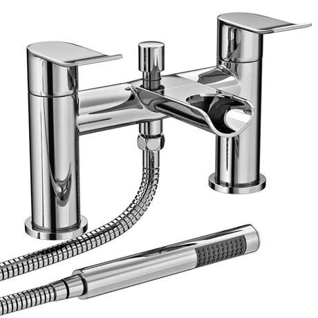 The designer Luna waterfall bath shower mixer has an open spout, creating a beautiful waterfall effect, complemented by lever handles that gives finger tip control of the temperature and flow of water into the bath. Includes the handheld shower head, wall bracket and the flexible hose.