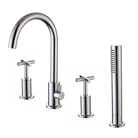 Contemporary styling and a crosshead handle design make this RAK Ella 4 Hole Deck Mounted Bath Shower Mixer a real eye-catcher. Made from high quality brass, the tap is beautifully finished in polished chrome. Suitable for low pressure water systems. Includes shower handset and hose.