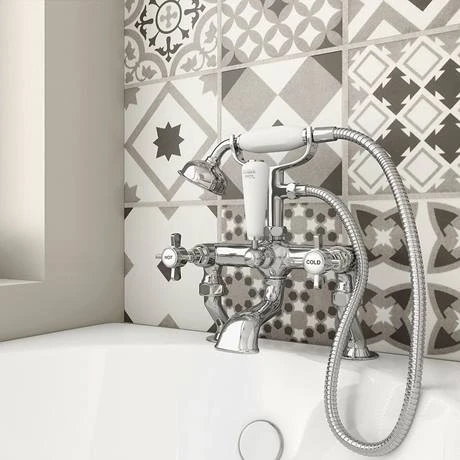If you’re a fan of all things vintage, you’ll love this old style Regent Traditional Cranked Bath Shower Mixer. The 300mm high bath mixer tap stands on cranked legs and boasts a stunning tapered spout, heritage cross head handles and a classic, telephone style shower and cradle. The set is manufactured from high quality brass for impressive durability. The chrome mixer tap boasts a lustrous polished finish and features gleaming white ceramic details on the lever diverter, shower handle and tap indices for a refined touch. Going for a coordinated look? Team it with the Regent Traditional Basin Taps.