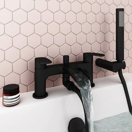 The sleek matt black modern waterfall bath shower mixer tap from our Valencia collection will transform your bathroom with it’s clean lines and elegant open spout which allows the water to cascade into your bath creating a beautiful waterfall effect. It’s sturdy brass body and stunning matt black finish ensure a cutting-edge aesthetic and impressive durability. It’s modern design will bring a touch of sophistication to your bathroom. Includes a shower kit consisting of a round hand held shower head, wall bracket and flexible hose.