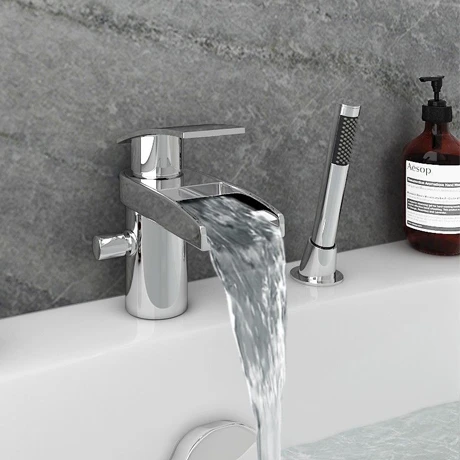 The integrated shower handset shares the mixer tap’s minimalist looks. For easy cleaning, it features a silicone nozzle – so any limescale deposits can simply be rubbed away. Match this waterfall bath tap with a Zen Waterfall Cloakroom Mono Basin Mixer.